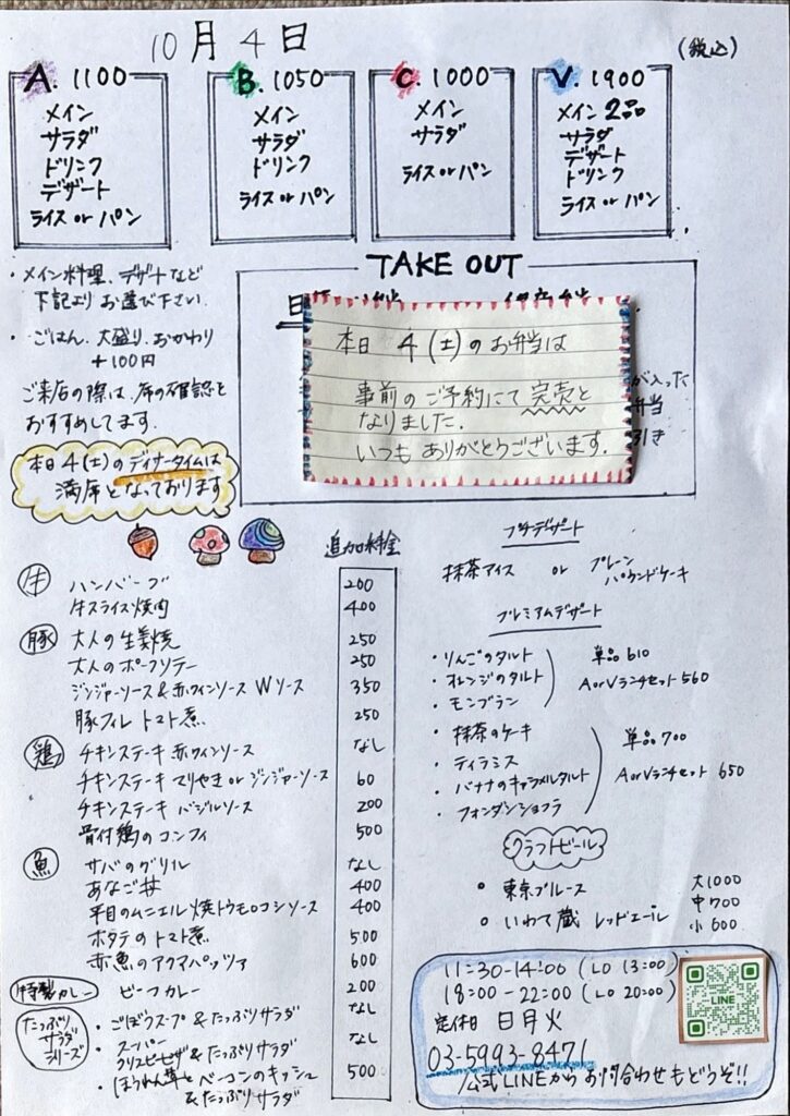 本日4日土曜日のディナータイムは満席をいただいております。お弁当も完売となりました。ありがとうございます。