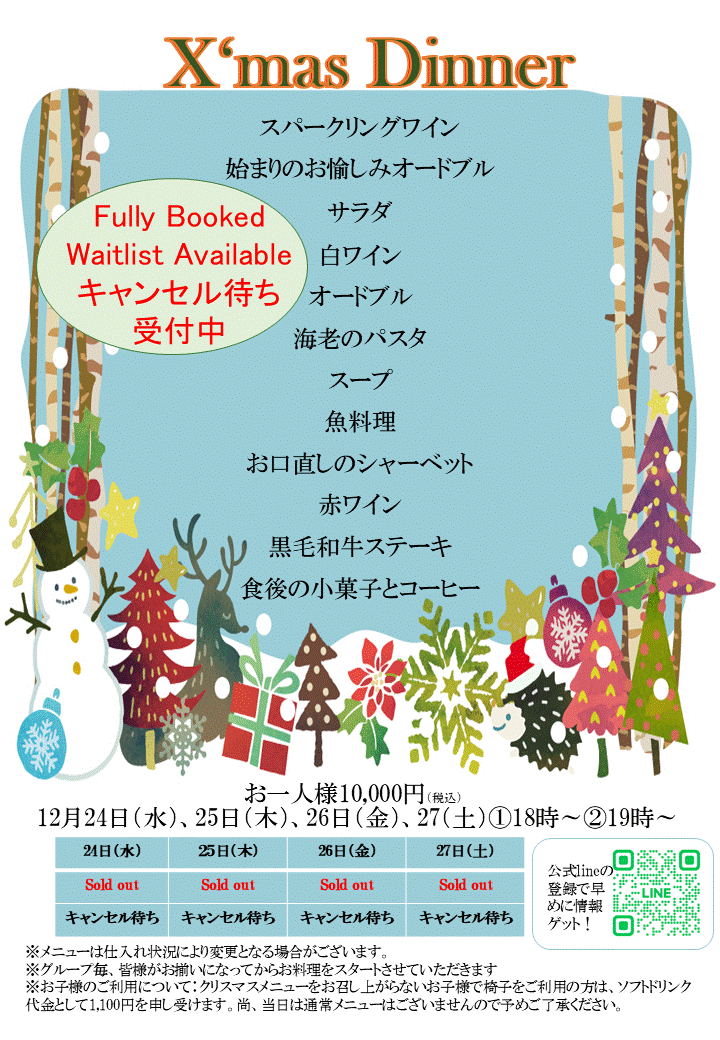 🎄クリスマスディナーパーティー ご予約満席のお知らせ🎄12月24日から4日間開催予定のクリスマスディナーパーティーは、おかげさまで 全日程満席 となりました。たくさんのご予約・お問い合わせをいただき、心より感謝申し上げます。なお、現在は キャンセル待ち の受付を行っております。ご希望の方はお気軽にお問い合わせください。皆さまに素敵なクリスマスをお過ごしいただけるよう、心を込めて準備を進めております。 その他 X Facebook はてブ Pocket LINE コピー 2025.11.02